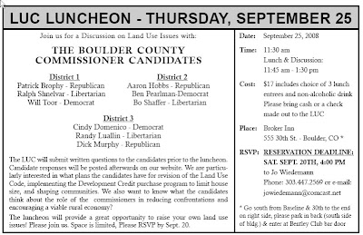 The (Boulder County) Land Use Coalition is sponsoring a luncheon with all 9 candidates for County Commissioner. That would be 3 Democratic incumbents and 3 challengers each from the Libertarian and Republican parties. Here are the details…